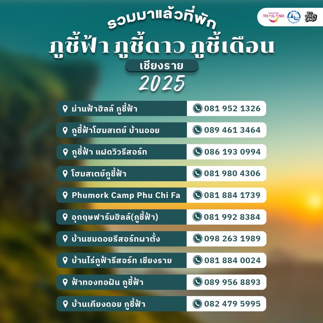 เปิด30ที่พัก ของสายลุยขึ้นภูชมหมอกเปิดประสบการณ์ท่องเที่ยวสัมผัสกับธรรมชาติอย่างแนบแน่น ไปกับ3ยอดภูหรือ3ยอดดอยสุดแสนฟินของเชียงราย ภูชี้ฟ้า,ภูชี้ดาว,ภูชี้เดือน อย่าลืมที่สุด!!เตรียมกล้องให้พร้อม แล้วไปล่า sunrise–sunseที่ยอดดอยกัน ททท.สำนักงานเชียงราย ได้มัดรวมมาให้แล้ว 30 ที่พัก แล้วมาเที่ยวเชียงรายให้สุดชิลสุดfun ไปด้วยกันนะ
